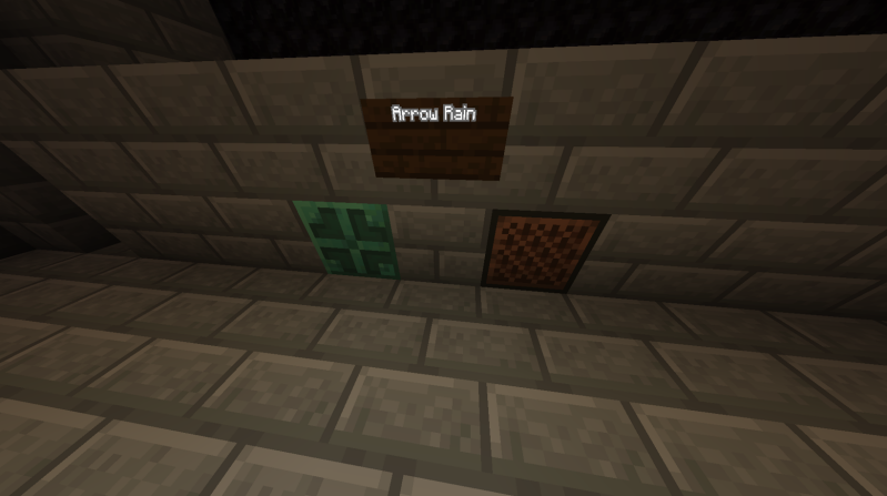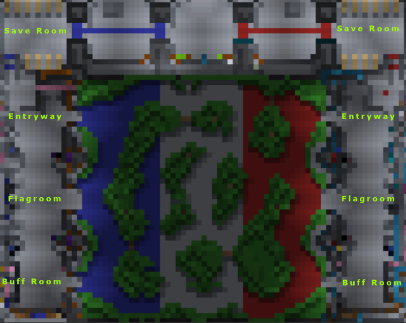 In this room you will throw your teams Buff Cards (acquired after completing a round and submitting the enemy flag or enemy heads into the previous rooms collection, Buffs are dispensed in the "Safe room" when Using the Poison De-buff for your Respawn Timer. when your Buff cards are submitted into these hoppers, after a moment they will be loaded and ready to use. For the three specific buffs seen on the wall here, they will not be "loaded and ready to use" until you press the associated note block and the light above is lit Designating that buff is loaded and ready to use. ALL BUFFS WITH TOP LIGHTS ON WILL FIRE AT THE SAME TIME.